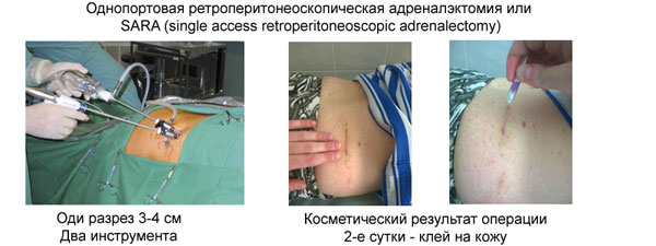 Однопортовая техника выполнения внебрюшинного поясничного доступа является самым современным методом удаления опухолей надпочечников. Основное её отличие от традиционной операции, наличие только одного прокола!, как правило, длиною 3 см, через который хирург проводит видеокамеру и необходимые инструменты. После выделения опухоли надпочечника производят его удаление. На кожу накладывают один шов и рубец на спине через несколько дней ели-ели заметен.
