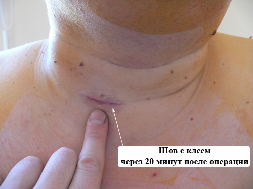 Кожная рана закрыта специальным клеем Dermabond, удобство это клея состоит в том, что пациент может принимать душ в день операции, а так же не требуется снимать швы.