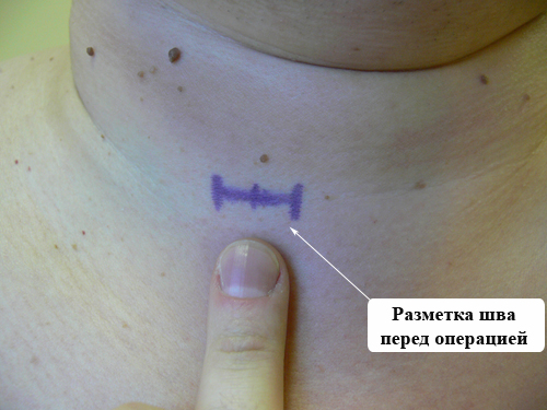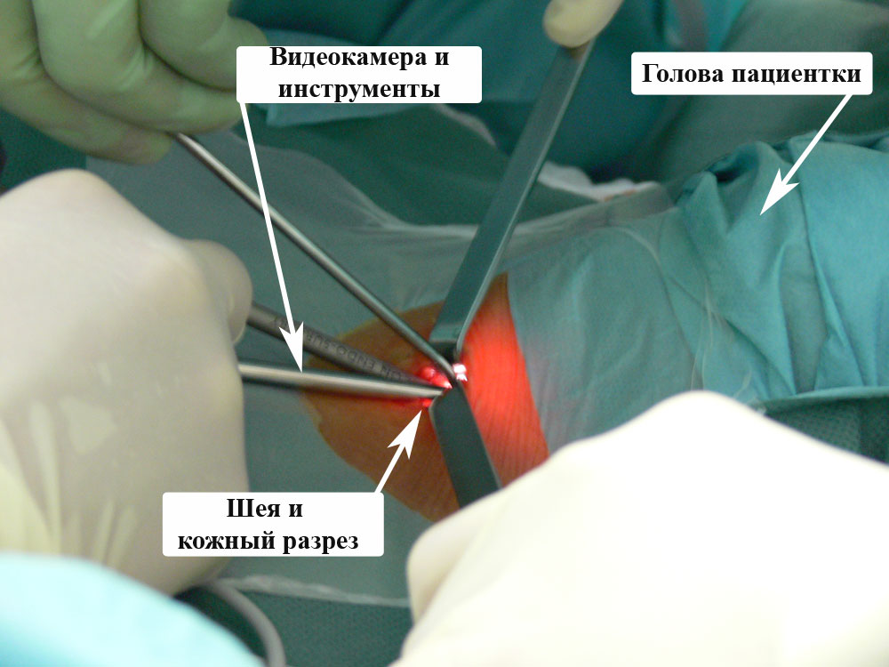Учитывая размер аденомы околощитовидной железы и ее локализацию, пациенту была выполнена видеоассистированная селективная паратиреоидэктомия (удаление аденомы околощитовидной железы с помощью видеокамеры через кожный разрез до 20 мм.).