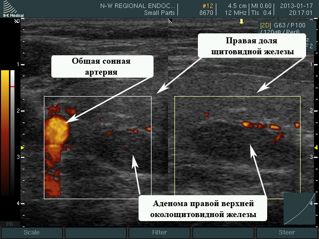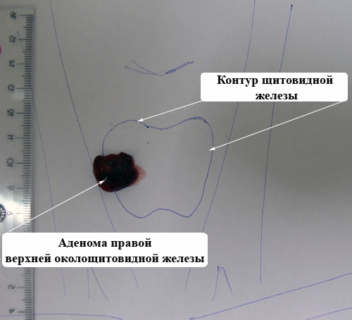 При выполнении УЗИ щитовидной железы в Северо-Западном эндокринологическом центре выявлено округлое образование размерами 14 на 9 на 18 мм, которое располагалось по задней поверхности правой доли щитовидной железы. Специалистами центра выполнена биопсия данного образования с одновременным выполнением анализа на паратгормон, так называемый «смыв с иглы», которой выполняли укол.