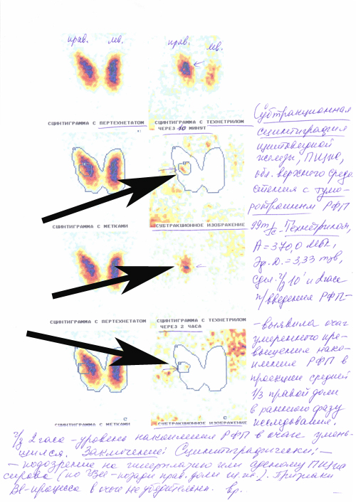 4. По данным субтракционной сцинтиграфии с технетрилом в проекции средней трети правой доли щитовидной железы выявлено интенсивное накопление фармпрепарата.