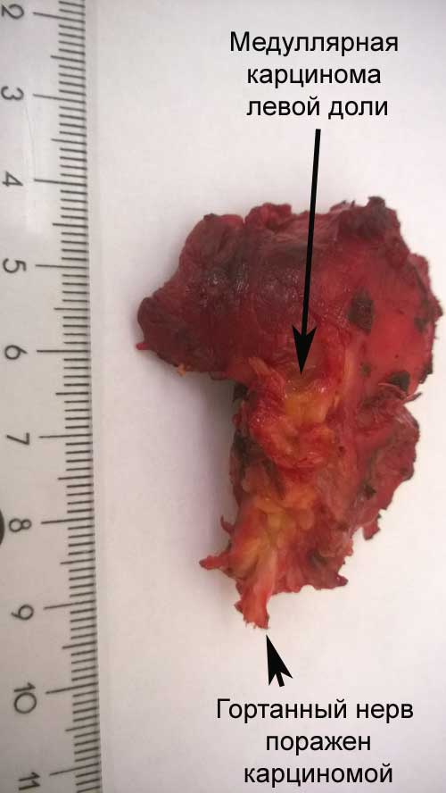 Выполнена операция - удаление щитовидной железы, лифатических узлов шеи VI, II, III и IV уровней. Особенности операции: при удалении опухоли с левой стороны выявлено прорастание медуллярной карциномы в левый гортанный возвратный нерв.