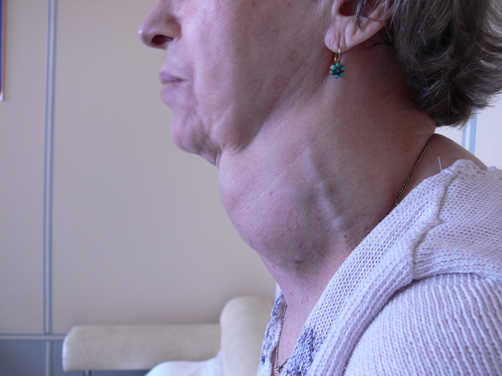 В плановом порядке выполнено оперативное вмешательство - тиреоидэктомия (полное удаление щитовидной железы). Пациентка выписана на 2-е сутки после операции в удовлетворительном состоянии. После операции жалобы на затруднение при глотании и дыхании прошли.
