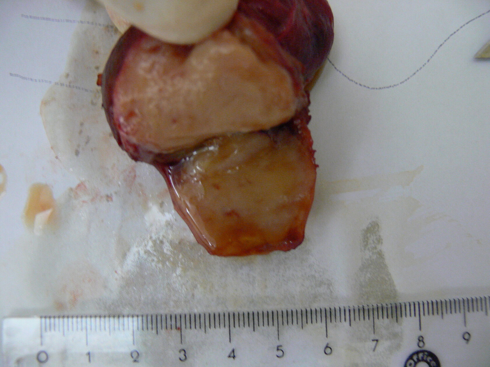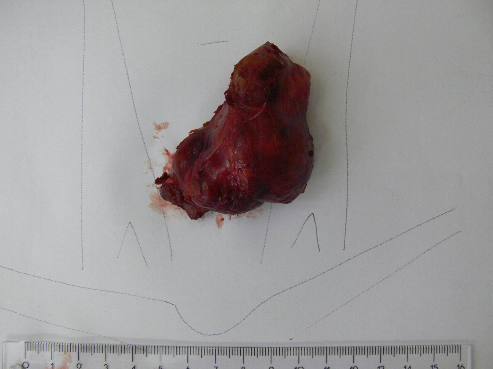 Послеоперационное гистологическое заключение: Мультифокальная папиллярная карцинома Tall Cell вариант и папиллярная карцинома, макрофолликулярный вариант левой доли щитовидной железы с инвазией капсулы последней.