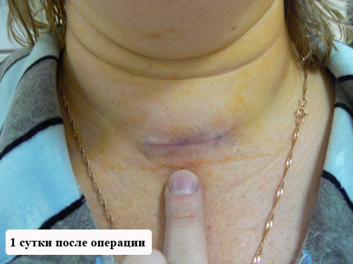 Кожная рана закрыта специальным клеем Dermabond, удобство это клея состоит в том, что пациентка может принимать душ в день операции, а так же не требуется снимать швы.