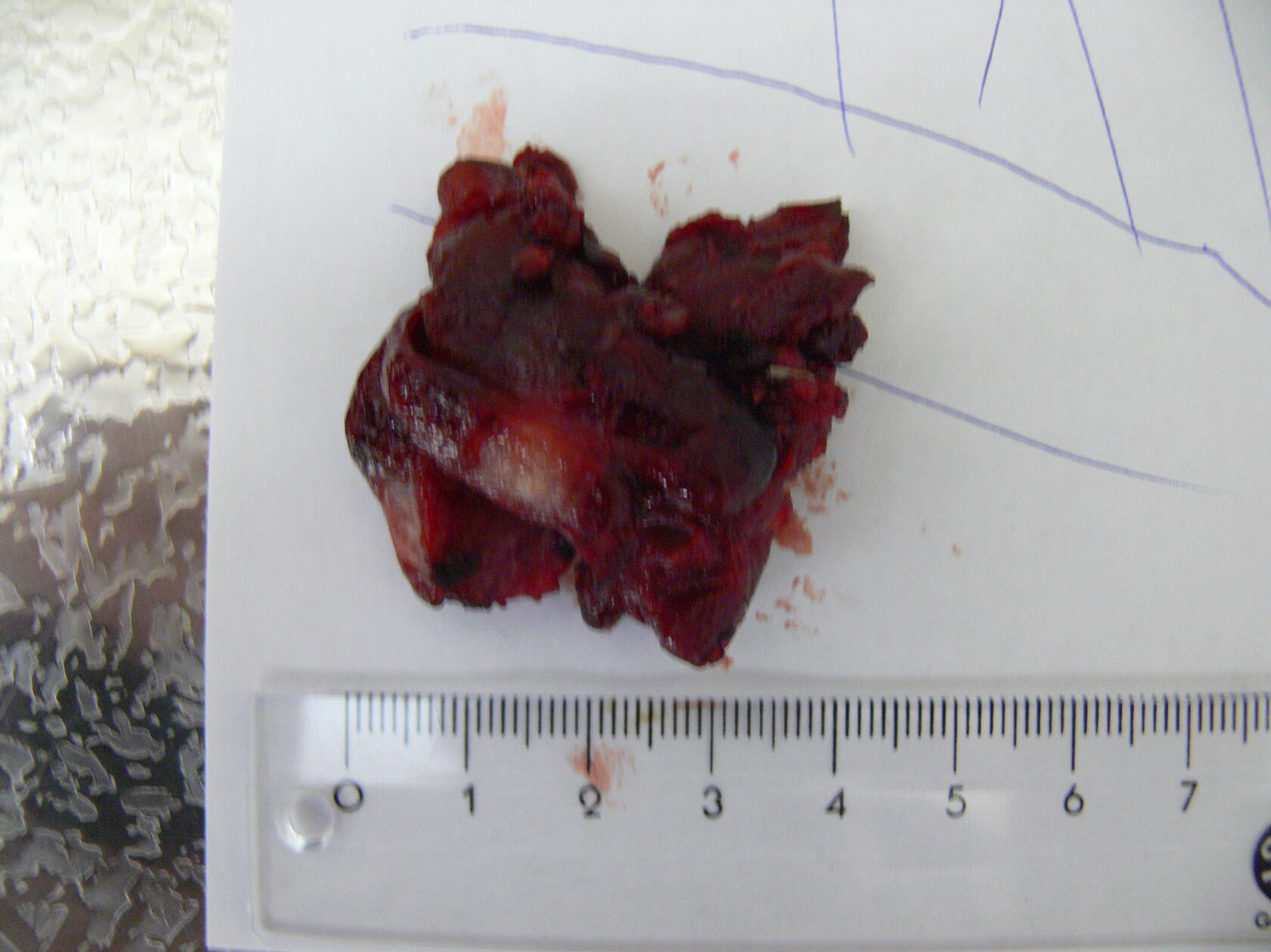 Под эндотрахеальным наркозом, с использованием специальных луп и очков, с использованием нейромонитора для визуализации возвратного нерва справа, пациентке удаления правая доля щитовидной железы. На операции выявлено, что опухоль прорастает короткие мышцы шеи. Выполнена профилактическая лимфодиссекция шеи справа.