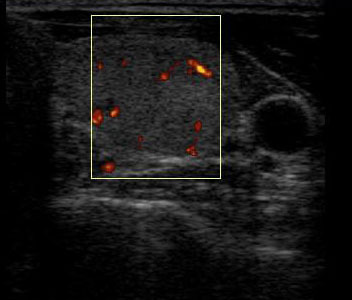 Узел по структуре изоэхогенный с четкими контурами и ободком Halo. По данным допплеровского исследования кровоток в узел смешанного типа - перинодулярный и интранодулярный.