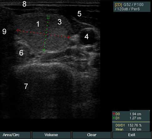 У пациентки 35 лет выявлен узел левой доли щитовидной железы. На снимках цифровые обозначения соответствуют следующим структурам