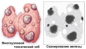 На долю многоузлового зоба приходится от 5 до 25 % больных с тиреотоксикозом (избыточная выработка гормонов). При данном заболевании имеется несколько автономно функционирующих аденом в щитовидной железе. Для данного заболевания можно выделить следующую триаду: