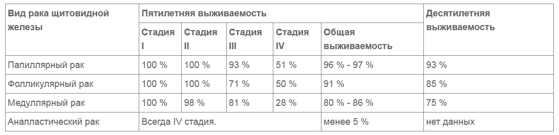 Высокой степенью злокачественности отличаются лимфома и анапластические формы тиреоидного рака. Наиболее доброкачественное течение имеют папиллярная и смешанная формы заболевания. У лиц среднего возраста лечение медуллярного рака проходит более благоприятно, чем у больных старше 60 и моложе 20 лет.
