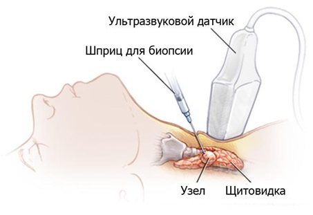 ТАБ представляет забор (аспирацию) содержимого узла при помощи специальной тонкой иглы. Биопсия показана при любых узловых изменения более 10 мм в диаметре.